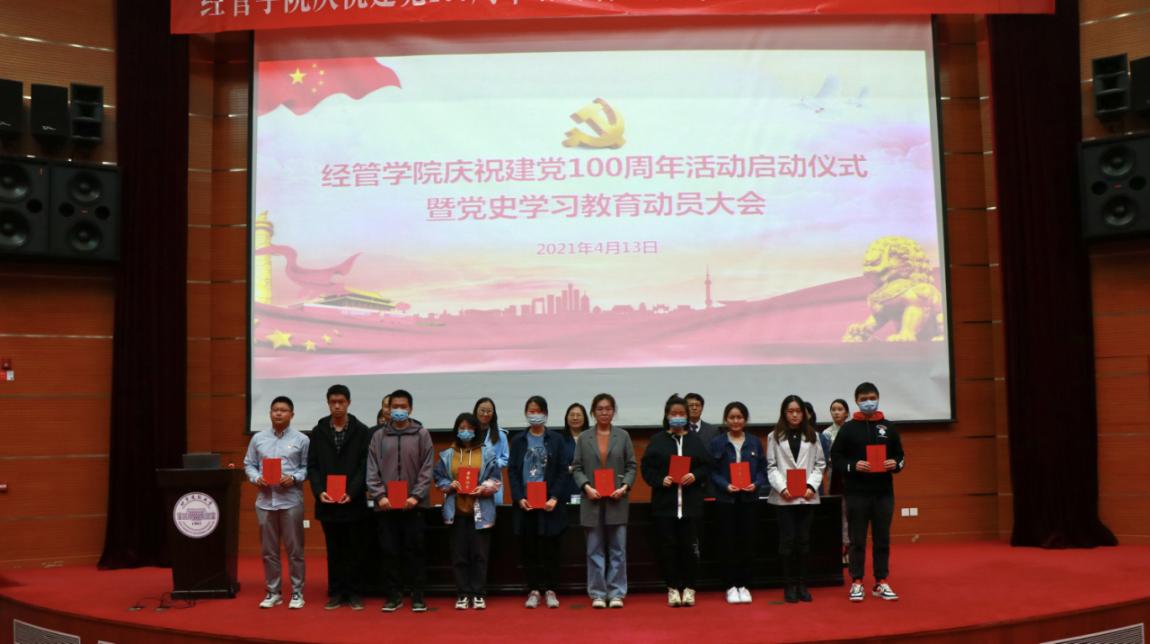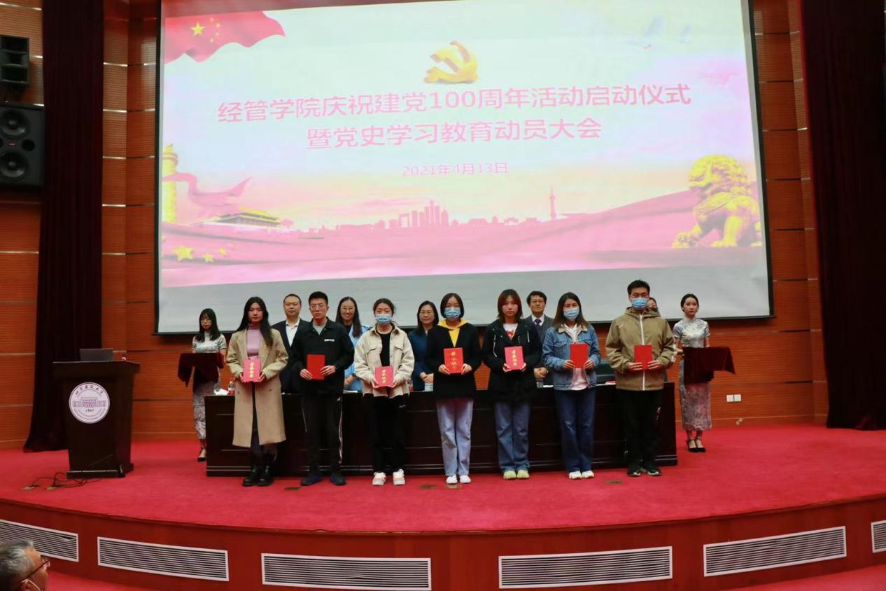 院学生会主席、青春榜样党员模范之星姚天琪发言。她表示,学生会将继续加强学生骨干队伍建设,充分发挥学生骨干在学生群体中的引领作用,积极塑造学生阳光心态,在党史学习教育和建党100周年活动中讲好红色故事、弘扬经管之声。我校党史团宣讲团成员、马克思主义扑克王 研究生王妍讲到,希望同学们要担起时代使命,努力成长为符合时代要求的社会主义建设者和接班人。两位青年学生站在党史学习、宣传的第一线,呼吁同学们为未来生活、奉献社会勤奋进取。