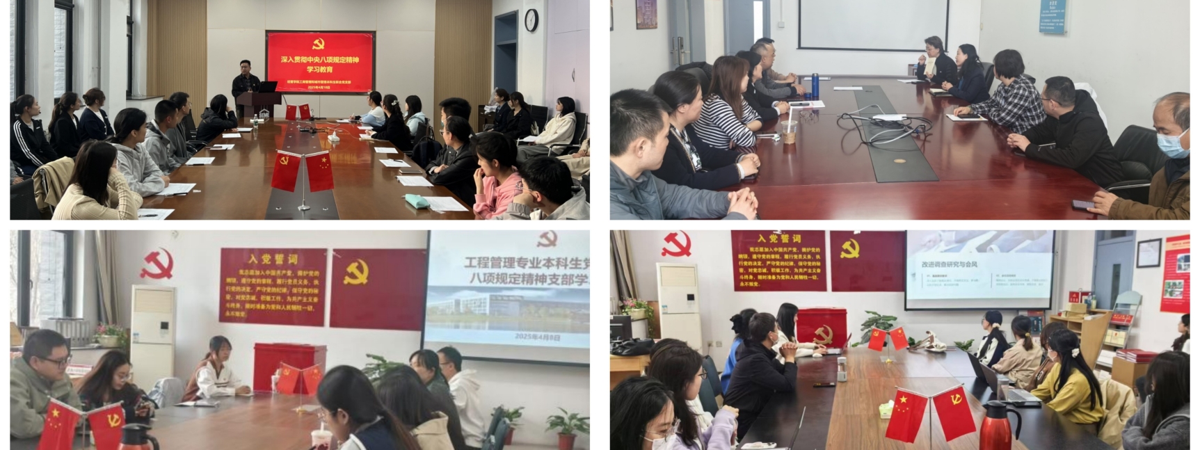 党支部对标笃行、推动学用结合。各党支部将学习教育与组织生活紧密结合,通过集中学习、支部书记讲党课、观看专题片等形式,组织全体党员原原本本学、原汁原味悟,推动学习教育全覆盖、见实效。目前,各支部累计组织学习活动16次。例如,工商系教师党支部书记围绕“杜绝‘四风’涵养高尚师德师风”讲授专题党课,引导教师党员坚守教育初心;工程管理本科生党支部以“廉洁自律从我做起”为题开展学习研讨,强化学生党员的廉洁意识和责任担当。