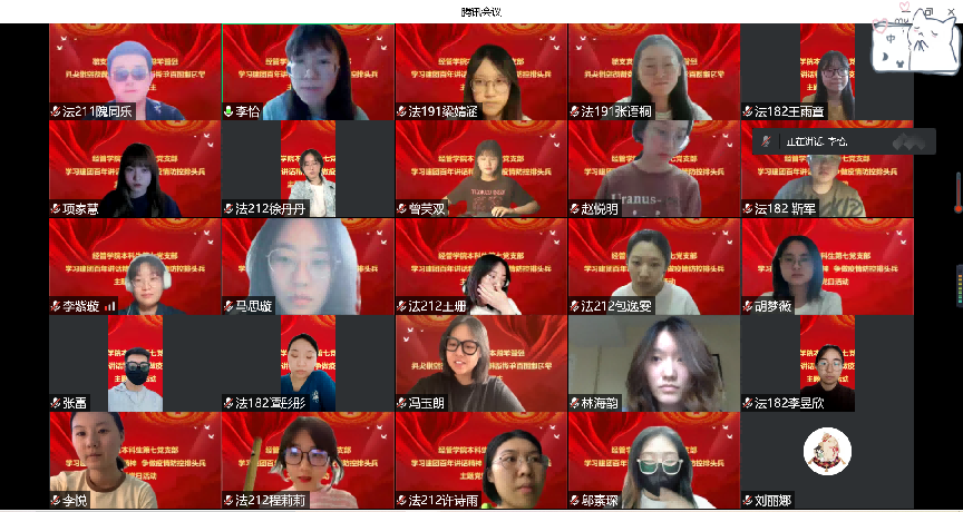 为深入学习贯彻习近平总书记5月10日在庆祝中国共产主义青年团成立100周年大会上的讲话精神,进一步发挥关键时刻党组织战斗堡垒和党员先锋模范作用,筑牢高校疫情防控坚实防线,2022年5月26日下午,扑克王官网 本科生第七党支部组织全体党员和入党积极分子代表通过腾讯会议召开了本次“学习建团百年讲话精神、争做疫情防控排头兵”主题党日活动。会议由李明芯同志主持,扑克王官网 副院长王丹老师参加活动并进行指导。