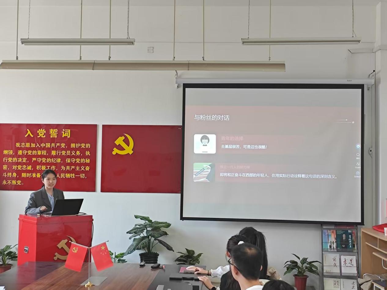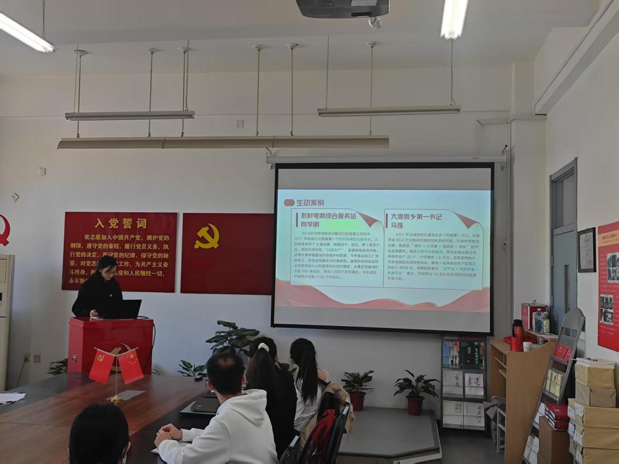 工商管理研究生党支部的曾秀青以“平凡岗位,不凡担当——在祖国需要的地方发光发热”为题,讲述了作为自媒体博主在生活中的点点滴滴,号召新时代青把爱岗敬业、争创一流的奋斗精神转化为服务社会的实际行动,在祖国需要的地方发光发热,以信念、奋斗和奉献书写无愧于时代的人生答卷,共同织就民族复兴的壮丽图景。