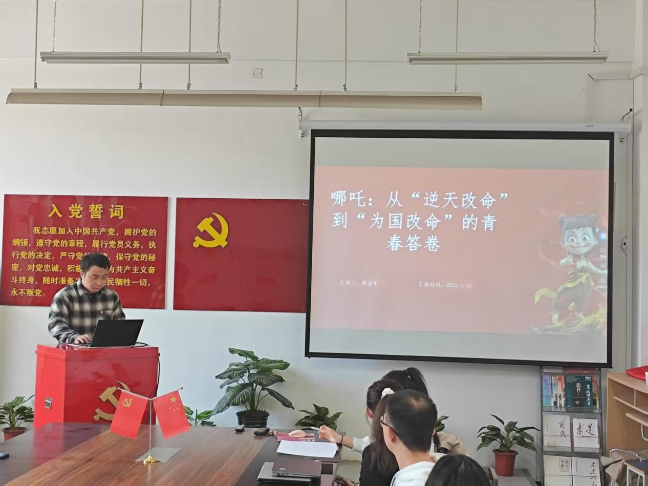 管理科学与研究生党支部的黄孟军以“哪吒:从‘逆天改命’到‘为国改命’的青春答卷”为题,讲述了新时代青年党员将个人奋斗融入国家发展的青春担当。号召大家既要以哪吒的反叛精神突破创新瓶颈,更要以陈塘关百姓的团结精神凝聚奋斗合力,在科技自立自强、共同富裕等国家战略中勇当主角,将“逆天改命”的个人英雄主义升华为“为国改命”的集体使命担当,在民族复兴的接力赛中跑出属于这代人的加速度。