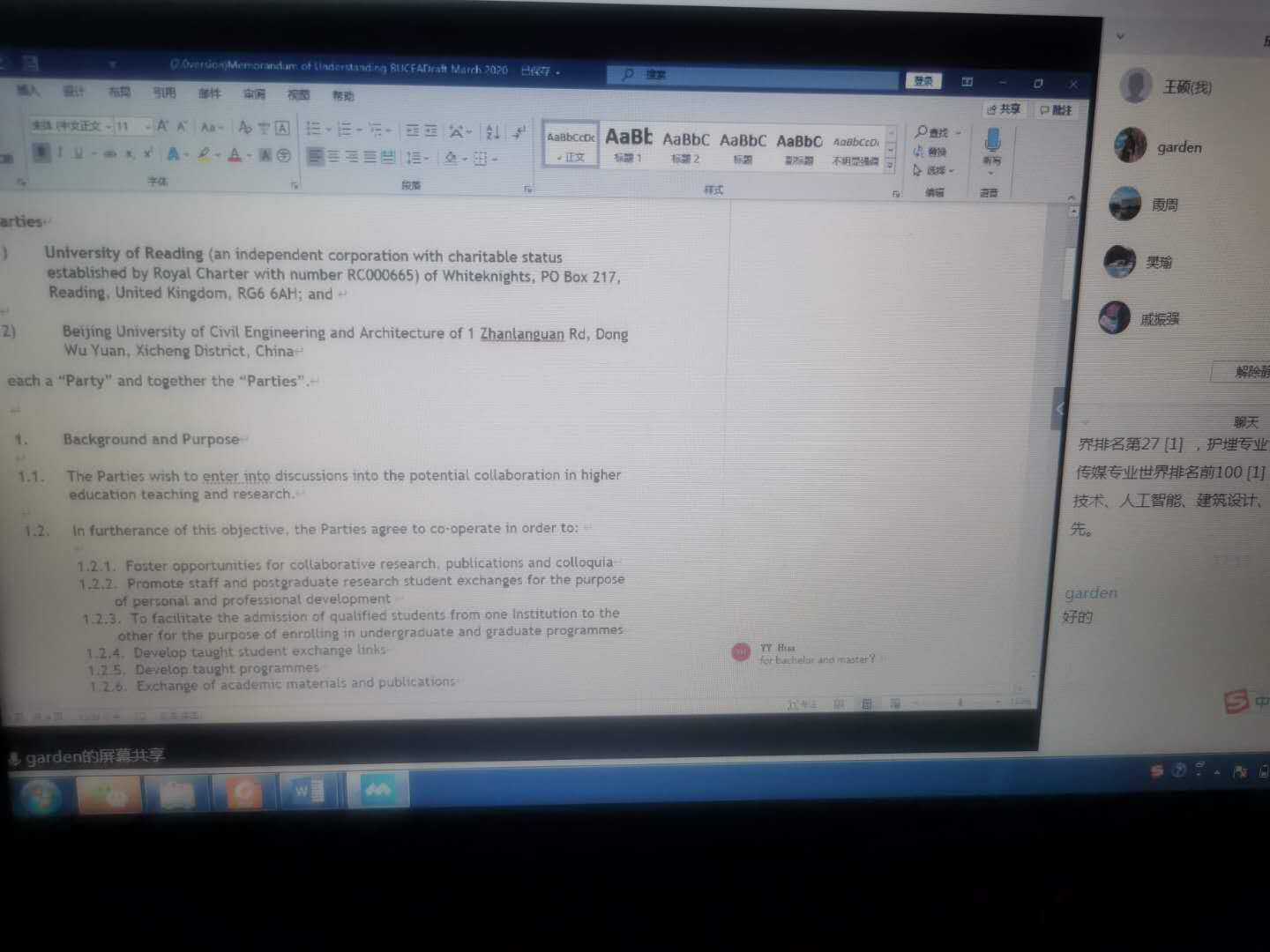 外事秘书李佳冰、王硕和花园园分别介绍了英国亚伯大学、澳大利亚迪肯大学和英国雷丁大学的项目协议内容,与会老师各抒己见,针对协议的合作事项、知识产权、法律效益、学校名称图标使用等条款提出了修改意见。会后由外事秘书整理汇总相关意见并发送给对方学校进一步修改确认。副院长周霞老师表示,在全球抗“疫”的关键时刻,更应着眼未来,尽快推进国际合作项目的签署进程,为“疫”后师生的国际合作交流创造良好条件。