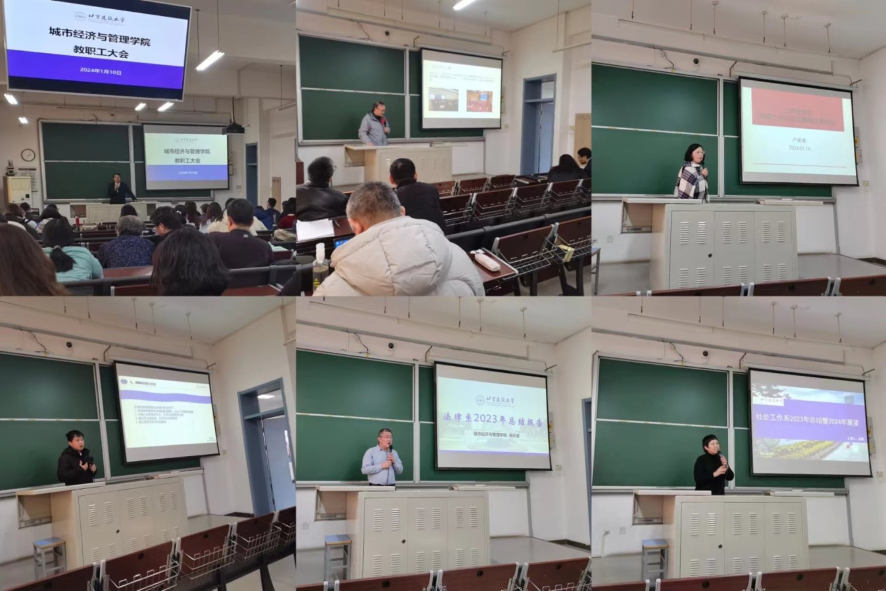 首先,赵金煜代表工程管理系、卢彬彬代表工商管理系、黄道涵代表公共管理系、杨长更代表法律系、晁霞代表社工系分别汇报了2023年的工作情况。他们详细介绍了各自系所取得的成果、遇到的问题及解决方案,并对未来的工作提出了展望。汇报内容涵盖了教学、科研、学生工作等多个方面,展现了各系在过去一年的努力和成绩。