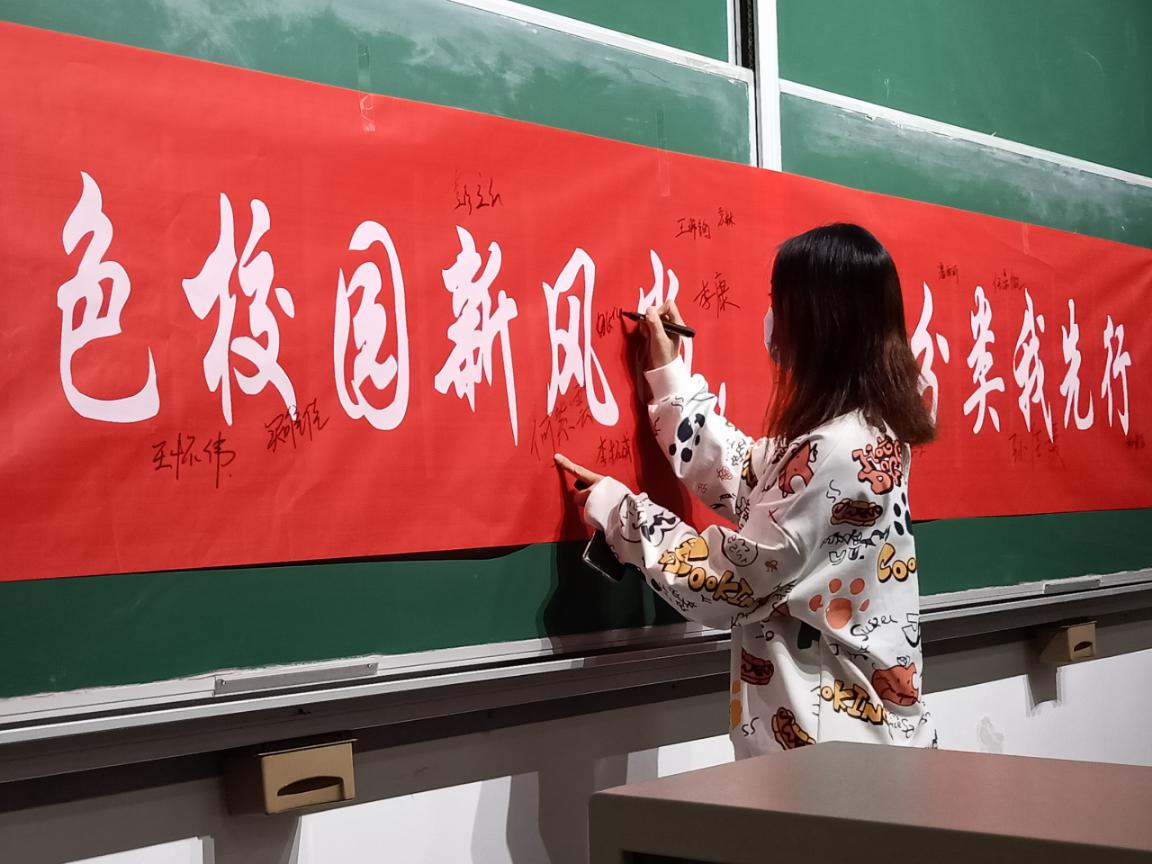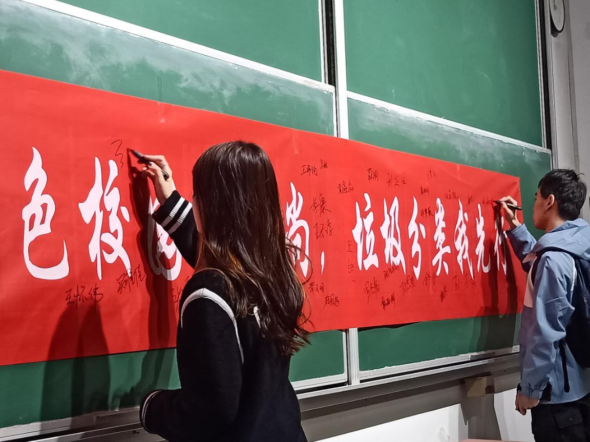 会议开始前,首先进行了签名活动,同学们积极参与。每一个签名,都是积极分子践行垃圾分类的宣言;每一个印记,都是同学承担使命与责任的担当。