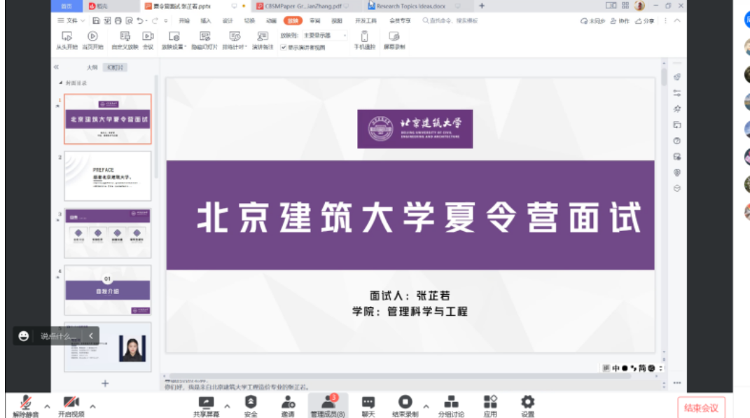 下午的考核测评环节,来自管理科学与工程学科和工商管理学科的5名老师组成考核组,对参加夏令营的十二位同学进行测评,同学们分别就自己的学业情况、科研兴趣、拟从事科研方向进行阐述,考核组对同学们进行面试和提问,并与同学们分享了科研经验与体会。