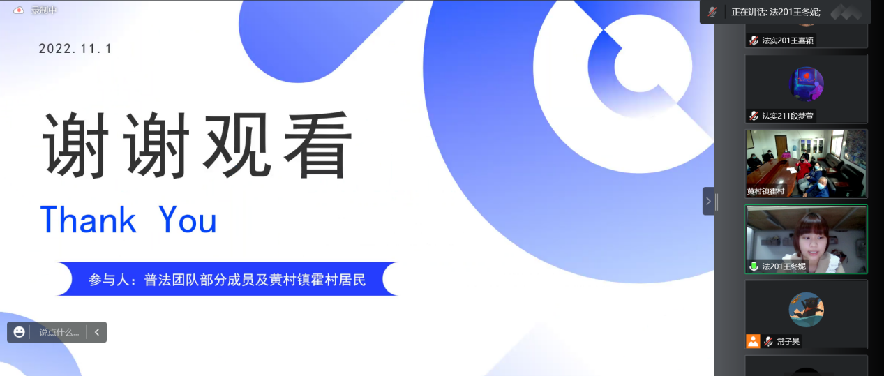 为深入学习贯彻党的二十大精神,切实增强群众法治意识,11月1日青春船长普法团队与黄村镇霍村开展“法在你身边”法治教育主题活动。本次法治教育活动由青春船长普法团队王冬妮同学主持,青春船长普法团队14名骨干认真组织,黄村镇霍村共计30余名居民参与。此次主要以专题讲座和互动研讨的形式开展,内容涉及到民法、劳动与社会保障法以及安全保障法三个方面,以法律专业知识解读切入,结合生活中常见的案例分析,使居民充分认识相关法律条款规定承担的法律责任,教育居民养成遇事找法、处理问题靠法的思维习惯和行为模式。