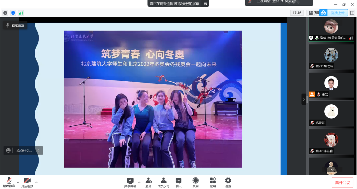 站位标兵、造价191班吴天昱的分享中全面介绍了训练日程及休息时间的校团体活动。她提到,“鸟巢训练更加考验心理素质和身体素质”,放弃滑雪杆,缩减标兵,方案数次修改,最终成为站位标兵。身为站位标兵,更多的是直接面对观众以及迎接运动员入场,要展示出东道主的积极热情,是代表中国,向观众招手,向运动员们招手,向世界招手。