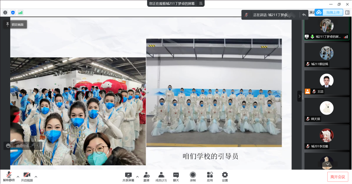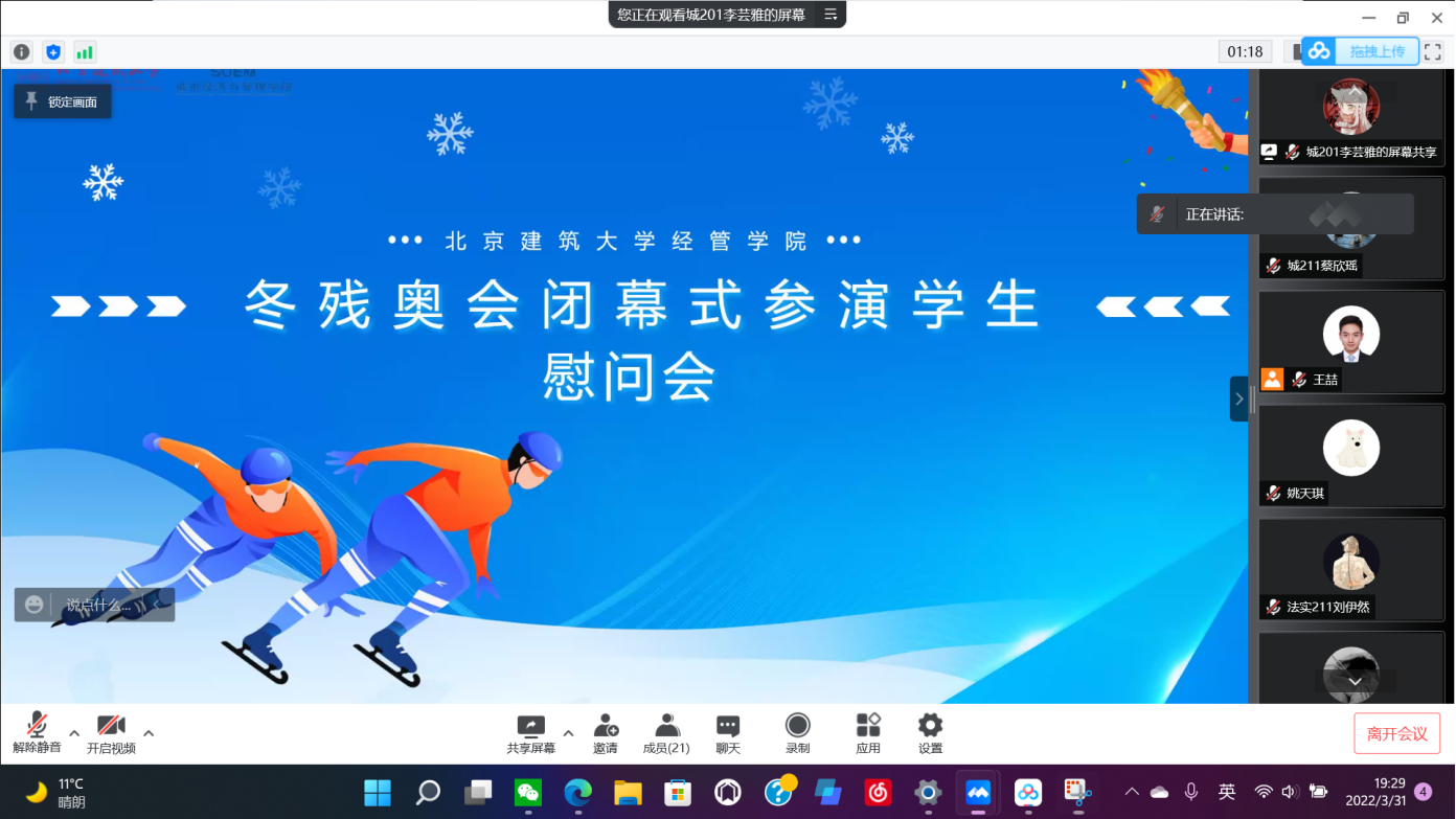 会上,站位标兵、城201班李芸雅展示冬残奥闭幕式参演同学驻地环境,对隔离政策进行介绍和说明。