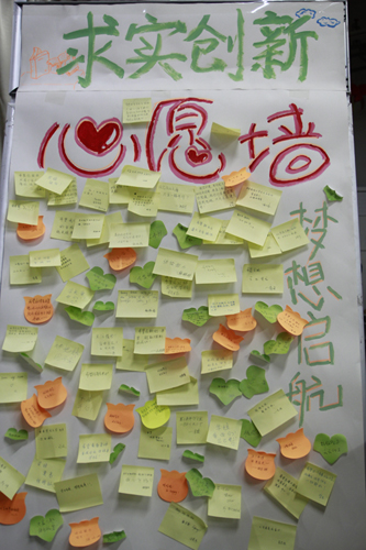 为新生配备的朋辈辅导员提供的一对一服务,让新生切实感受到了学校的热情周到的文化气息;同时代表青春的绿色和代表梦想的紫色给“聚能环”赋予了更多的含义,将经管学子的青春成才梦传递到了新生手中。 “心愿卡”取义“梦想启航”,启发新生畅想大学生活,树立远大理想,成为追梦的莘莘学子的同路人。“希望学业有成”、“新生活、新起点”、“我希望成功”、“梦想成真”、“和大学同学一起放飞理想”……一个个淳朴真挚的愿望被记录下来,一个个美好的愿望正在冉冉升起。在梦想实现的过程中,聚力同行,让青春的奋斗不孤单,而是充满友谊与温暖。