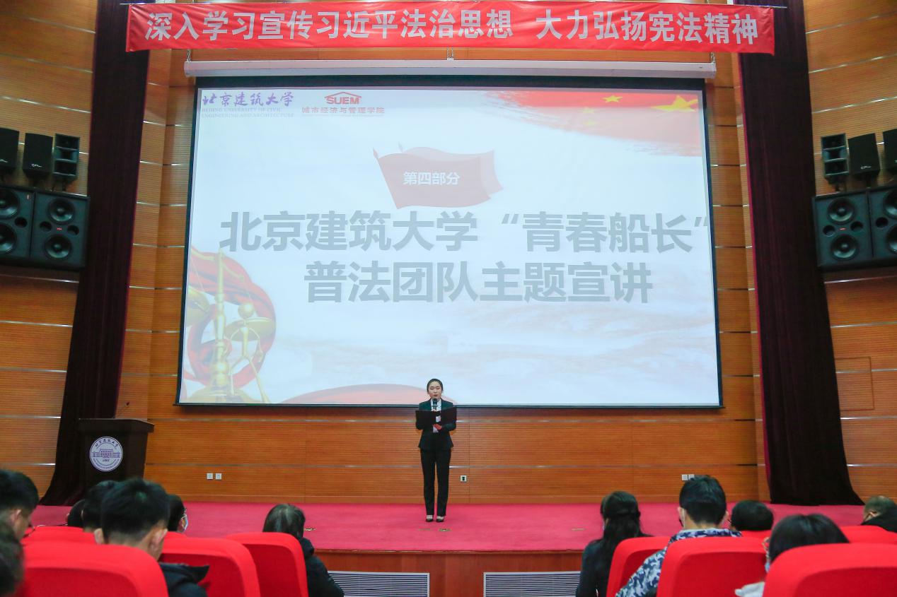 北京建筑大学青春榜样团队“青春船长”普法团队法181杜雨晴同学以“践行法治梦,青春勇担当”为题作主题宣讲,团队不忘普法初心,充分发挥专业优势,主动服务社会,推动大学生普法进校园、进社区、进乡村,传播法律正能量,为在全社会营造尊法、学法、知法、懂法、守法的良好氛围贡献青春力量,展现青年学生在法治事业中的使命担当。
