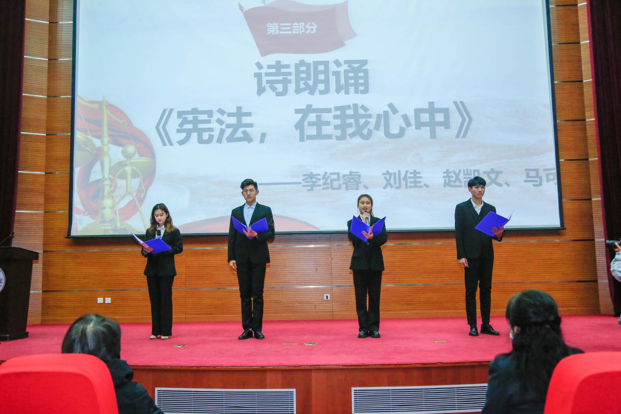扑克王官网 学生代表朗诵《宪法,在我心中》,同学们精神饱满,情绪高涨,“宪法在我心中,宪法在你心中,宪法在我们的心中”表达了尊崇宪法、学习宪法、遵守宪法、维护宪法、运用宪法的观念深入人心,现场掌声不绝于耳。