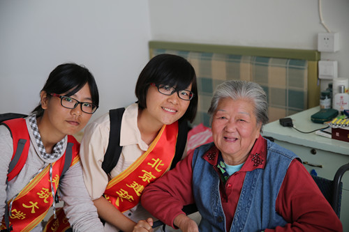 一大早,志愿者们就来到了新秋老年公寓,在工作人员的带领下,志愿者们熟悉了医院环境后便很快投入到自己的工作中,志愿者们推老人出去晒太阳、给老人们剪指甲、梳头发,维吾尔族的姑娘跳起具有民族风情的舞蹈,老人们看的目不转睛;台上我们唱起澎湖湾,台下老人们跟着和唱,我们仿佛看到了老人们年轻时的青春潇洒。在与老人们聊天过程中,老人们主动向着志愿者们讲起他们的故事,同学们一边被老人们的故事深深吸引,认真倾听,一边用歌声去扫除老人们心中的孤单,一时间院子里欢声笑语,不曾停息。