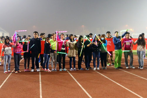 组织300余名学生手持或穿戴各种荧光灯具环校夜跑。霎时间,操场里,宿舍区,教学楼间,图书馆前,建大湖畔,鲁班广场边,到处璀璨缤纷,荧光闪耀,成为了校园的一道风景。