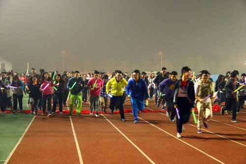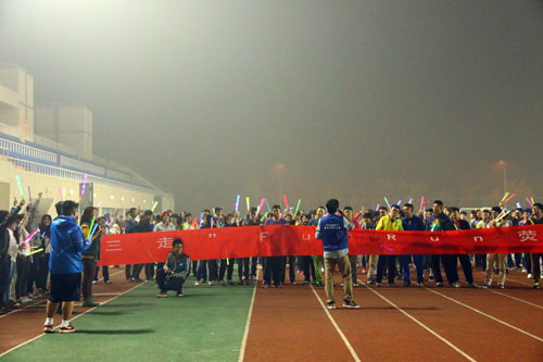 10月9日晚上8时许,数百名同学已经聚集在操场领取荧光装备,原本寂寥的场地,马上变成了荧光悦动的舞场。五颜六色的荧光棒、荧光胸牌,荧光泡沫管,荧光贴纸交相辉映,前来参与夜跑的学生成为了夜晚校园的主角。