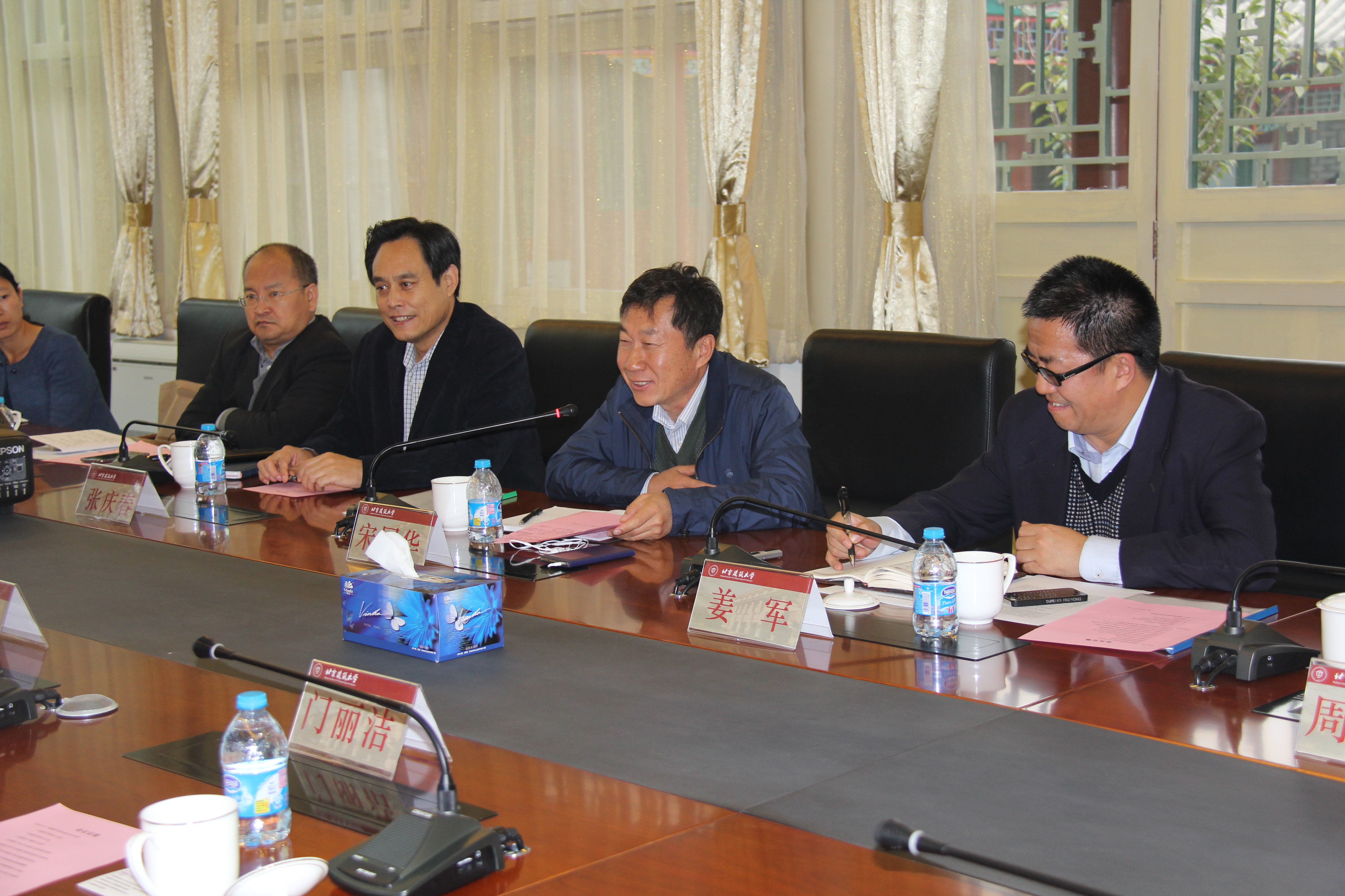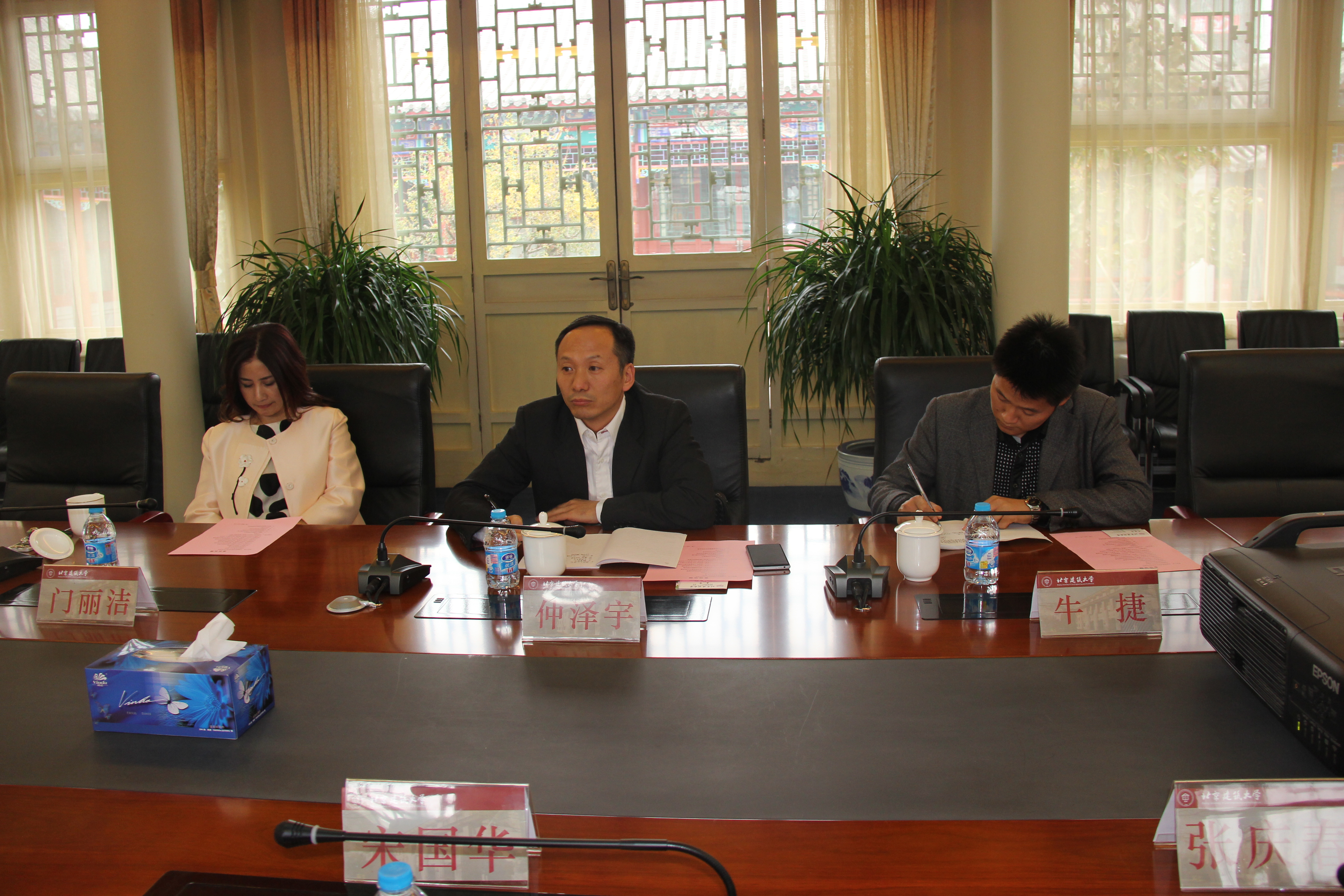 座谈会前,中国服务贸易协会仲泽宇秘书长一行三人观看了北京建筑大学专题宣传片。