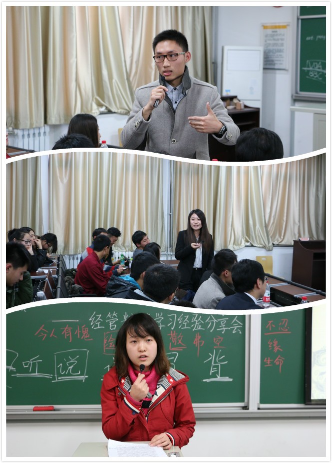 北京工业大学研究生王宇纯同学从自身经历谈起,依托专业,为同学们分析了考研、就业、出国三种选择的利与弊,以及针对个人选择背景下对大学生活应如何规划。北京理工大学梁程智同学以一首千年之前的劝学诗开首,与在座同学分享自己的学习价值观。他将自己的英语学习五字诀窍“听、说、读、写、背”分析的生动具体、鞭辟入理。他的“注重学习效率,保证学习质量”的学习理念让同学们耳目一新,他倡导终身学习、广泛学习、博览群书,成一家之言。北京航空航天大学的李家鸿同学与大家详细分享了自己大学四年的规划,建议同学们学会管理时间,做自己时间的主人。同样来自北航的杨静同学以“敬心 诚意”为出发点,分享自己的学习和生活态度。她从自身经历出发,说明积极心态对自己身心的重要意义。整场讲座高潮迭起,掌声不断。