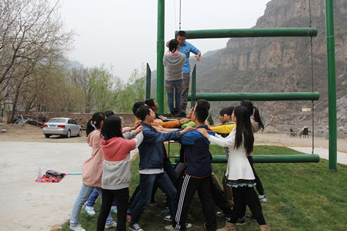 接着,展开高空断桥和信任背摔两个项目。“信任背摔”是一项极具挑战性的游戏:一名同学站在高1.5米的平台上,背对地面向后倒下,下面由十几位队友手臂交叉形成人墙,接住倒下的学员。这项活动主要培养了大家对同伴的信任,而信任来源于承诺,正是来自队友“准备好了,请相信我们!”的承诺,在大家的鼓励下,让胆小的学员也敢摔下。同样,在空中断桥项目环节中,有很多同学,信心不足,不敢跨越,这时队友们一句句“加油”、“我们相信你一定可以”等激励的喊声,鼓励了所有队友挑战恐惧挑战自我的顺利通过,团结就是力量,信任就是放心,通过两个活动的开展,两支队伍的配合默契越来越高,凝聚力在不断提升。之后,两队队员在鼓上颠球、蛟龙出海、超越光速等活动上展开比拼。其中,鼓上颠球和蛟龙出海让全体队员识到团队成功是个人成功的基础,个人成功必须建立在团队其他成员的共同努力与共同支持的基础之上。毕业墙是整个素质拓展活动的最后一个环节,面对要攀爬4.2米高的毕业墙,很多队友感到未知、疑惑、恐惧。在教练的指导下,在同学们的默契配合下,全体成员仅耗时23分钟就全部顺利通过毕业墙的攀爬。