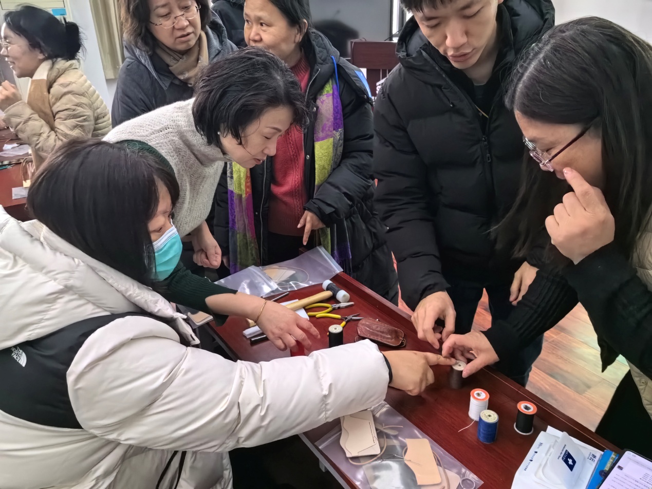 随后,皮具社的老师向大家介绍了皮艺制作的基本知识和技巧,并亲自示范了如何制作卡包和钥匙包。女教师们听得津津有味,纷纷动手尝试。在皮具社老师的指导下,大家充分发挥自己的想象力和创造力,将一块块普通的皮革材料变成了独具特色的皮艺品。