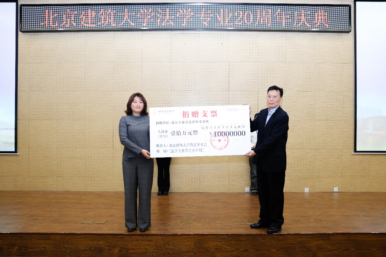 为鼓励同学奋发成长,学习提升,北京天驰君泰律师事务所为北建大法学专业捐赠10万元,设立天驰君泰奖学金,用于激励北建大法学专业的学生们更加努力学习,成长为优秀的法律人才。北京建筑大学校友联络发展处处长、教育基金会秘书长朱俊玲代表学校接受捐赠,北京天驰君泰律师事务所党委书记杨晓明出席捐赠仪式并致辞。他指出,天驰君泰与北京建筑大学在校企合作、党建共建方面有着深入地交流合作,希望以此次捐赠为契机,表达对北京建筑大学法学专业的祝福和关切,期待日后在交流合作和法学人才的交流培养方面进行资源共享,优势互补,共同探索符合中国特色的法治人才培养新模式。