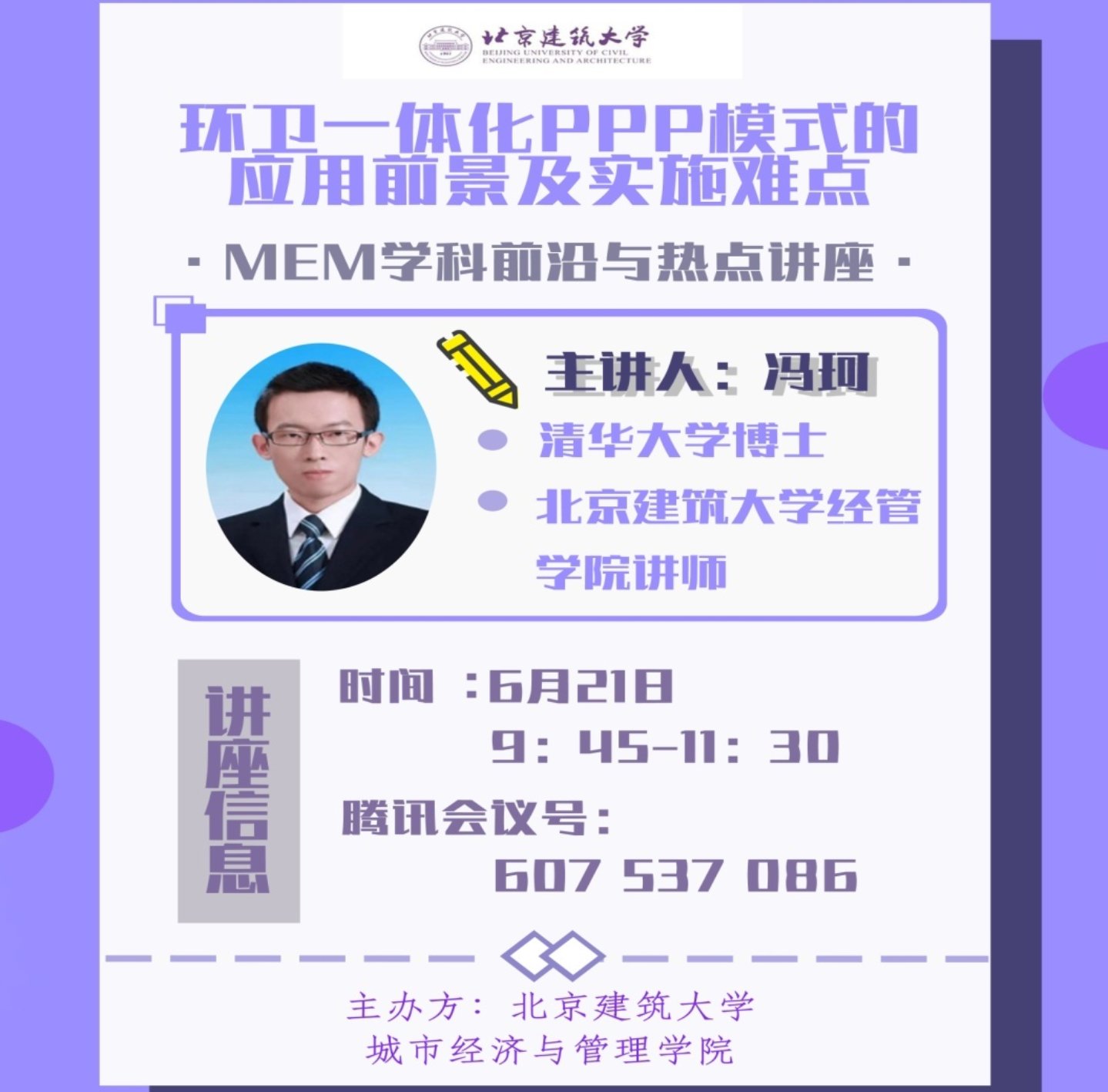 为了拓宽MEM专业学生知识面,提升工程管理学术水平,了解建设领域最新政策和发展,6月21日上午,扑克王官网 MEM中心继续举行了学科前沿与热点问题线上学术讲座。本次讲座由冯珂博士主讲,主题是“环卫一体化在PPP模式中的应用前景及实施难点”,MEM中心主任戚振强副教授主持。MEM专业全体同学准时参加学术讲座,还有部分师生旁听。