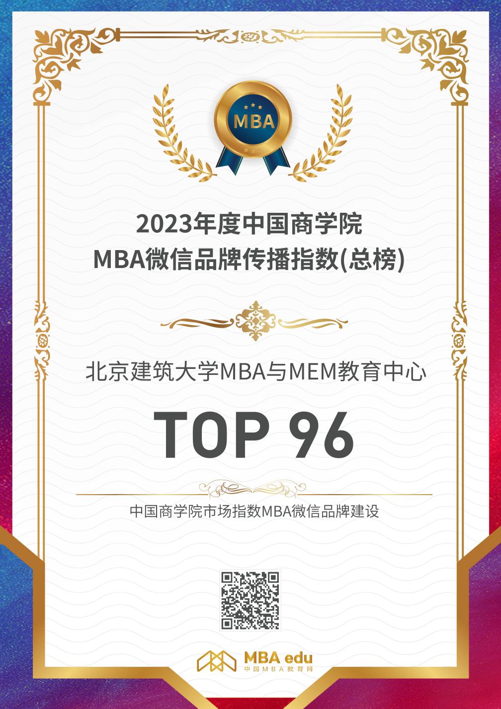 “北京建筑大学MBA与MEM教育中心”微信公众号聚焦商科教育,展示项目风采,在内容、互动、风格等方面不断加强创新投入,持续输出优质内容,在“2023全国商扑克王 微信品牌运营 TOP100”榜单中位列第96位。