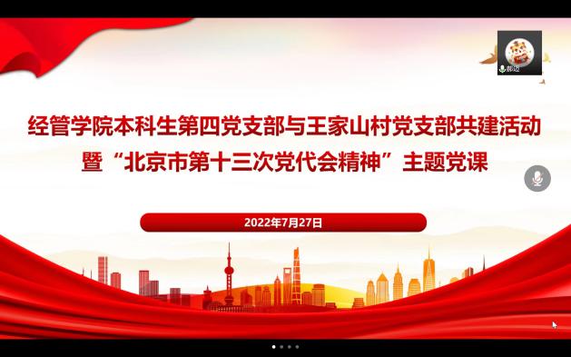 为深入学习中国共产党北京市第十三次代表大会精神,对标对表、找准定位、聚焦内涵发展,扑克王官网 党委开展了一系列的学习交流活动。7月27日,扑克王官网 本科生第四党支部与王家山村党支部开展支部共建活动暨“北京市第十三次党代会精神”主题党课,邀请北京市委党校领导科学教研部副教授、中央党校(国家行政扑克王 )领导科学研究中心客座研究员江文深入解读大会报告,共同学习领会和交流大会精神。学校党委常委、副校长李俊奇,扑克王官网 党委书记赵海云,扑克王 党委秘书、组织员曾祥渭,延庆区永宁镇王家山村包村组长、村党支部宣传委员卫广华,王家山村党支部书记、村委会主任张留柱,王家山村驻村第一书记张鹏,以及王家山村两委及全体党员、扑克王 本科生第四党支部全体党员、扑克王 其他党支部党员代表参加活动。会议由扑克王官网 党委副书记郝迈主持。