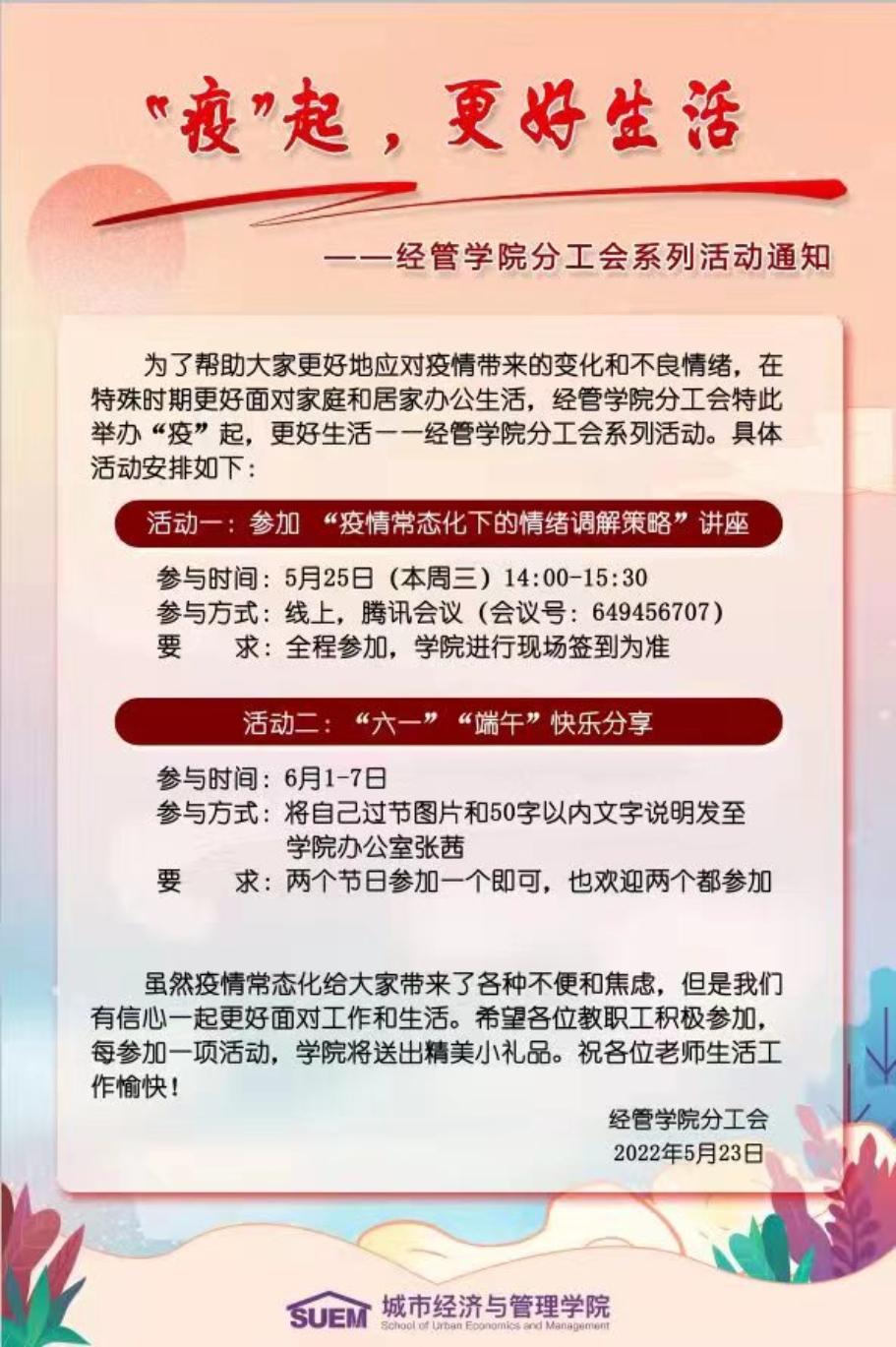 分工会系列活动。 系列活动分为两部分:参加“疫情常态化下的情绪调解策略”讲座及分享“六一”儿童节和端午节自己的过节心情。