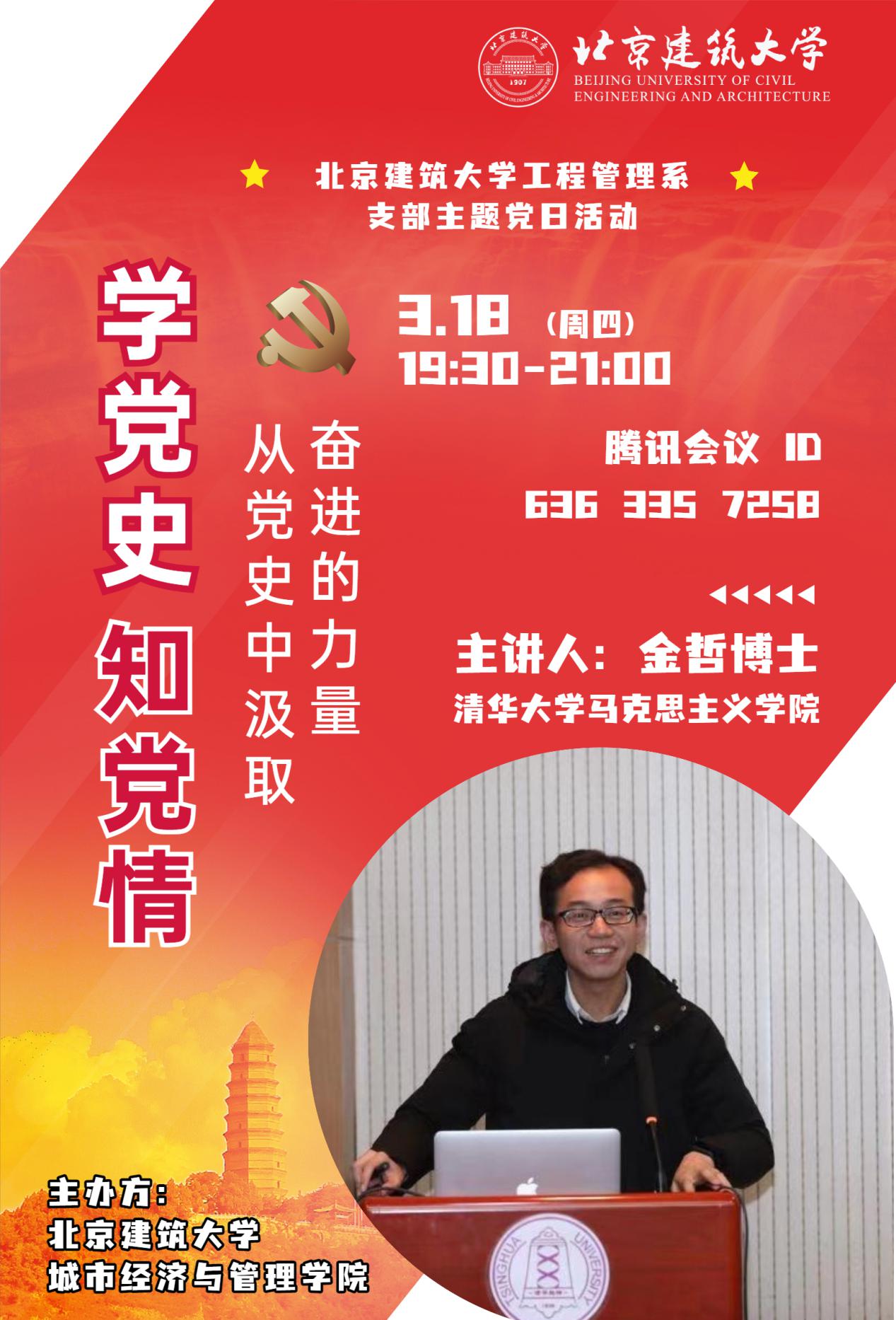 3月18日,工程管理系开展“学党史、知党情,从党史中汲取奋进的力量”主题党日活动。本次主题党日活动要求清华大学马克思主义扑克王 金哲博士做专题报告。