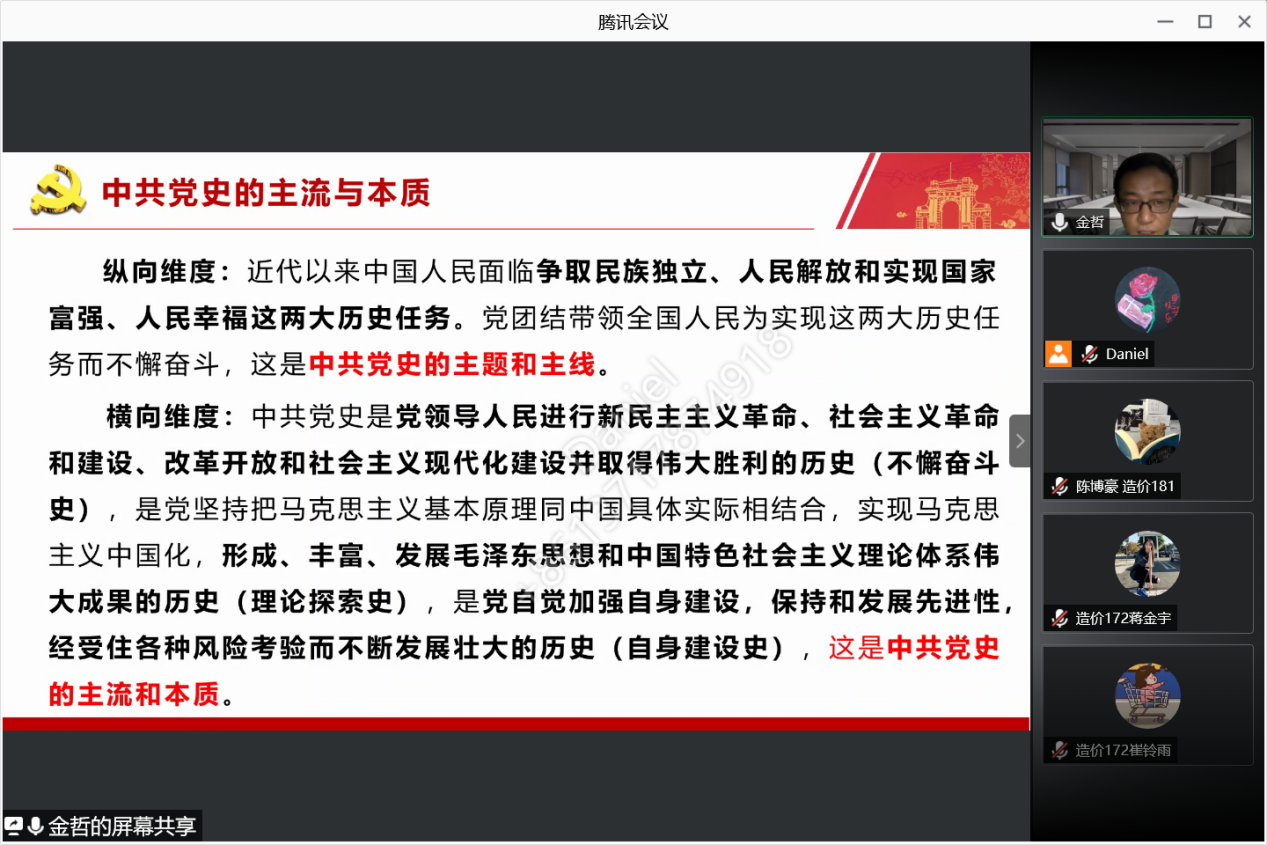 参加本次主题党日活动的还有工程造价专业本科生党支部全体党员。在金博士的主题报告之后,党员进行了分享了学习党史的心得体会并且和金博士进行了交流探讨。