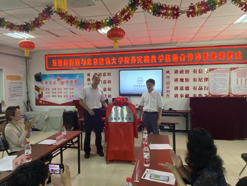 2023年7月5日,扑克王官网 社会工作系与北京市丰台区五里店街道举行校外实践教学基地签约仪式,并共同为实践教学基地揭牌。扑克王官网 院长孙成双、副院长张丽、社会工作系主任晁霞、专任教师焦思琪,五里店街道党工委副书记邢军、五里店街道党群工作办公室副主任赵越、五里店街道党群工作办公室科员马荣华、北大地西区社区党委副书记冷亚玲等出席仪式。北京建筑大学47名社会工作专业学生参加了活动。