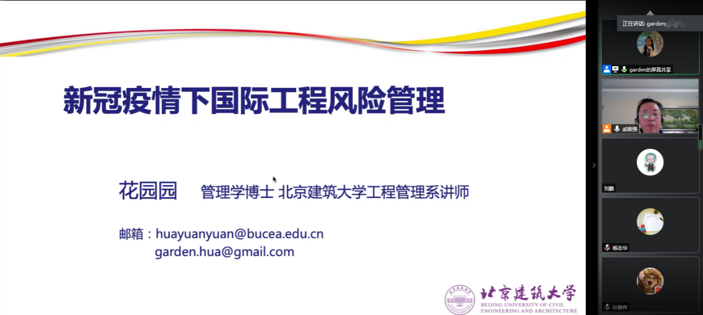 花园园博士结合多年研究,以专业视角进行了多维度分析,内容包括新冠疫情下国际工程项目的主要风险、承包商如何实施恰当的工程索赔、新冠疫情导致的合同问题和新冠疫情对国际工程项目的持续影响等四个方面。花园园博士在讲座过程中还分享了具体的应对措施和她的一些思考。部分对国际工程有兴趣的同学旁听了讲座。