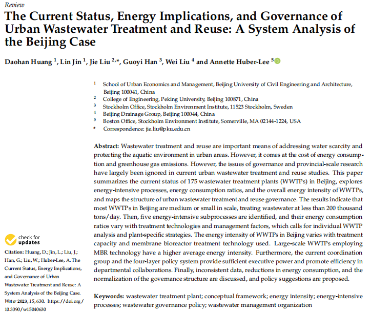 近日,扑克王官网 城市管理专业本科生金琳在国际学术期刊Water(SCI,2022年IF=""3.53)发表题为“The" Current Status, Energy Implications, and Governance ofUrban Wastewater Treatment and Reuse: A System Analysis ofthe Beijing Case”的综述性论文(DOI://doi.org/10.3390/w15040630)。论文聚焦北京市污水处理厂,从现状分布、能耗、治理三个维度开展系统分析,提出未来发展策略。