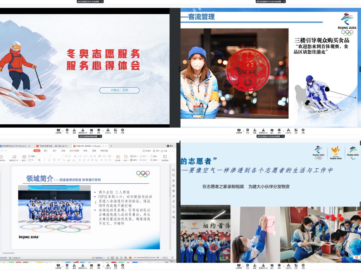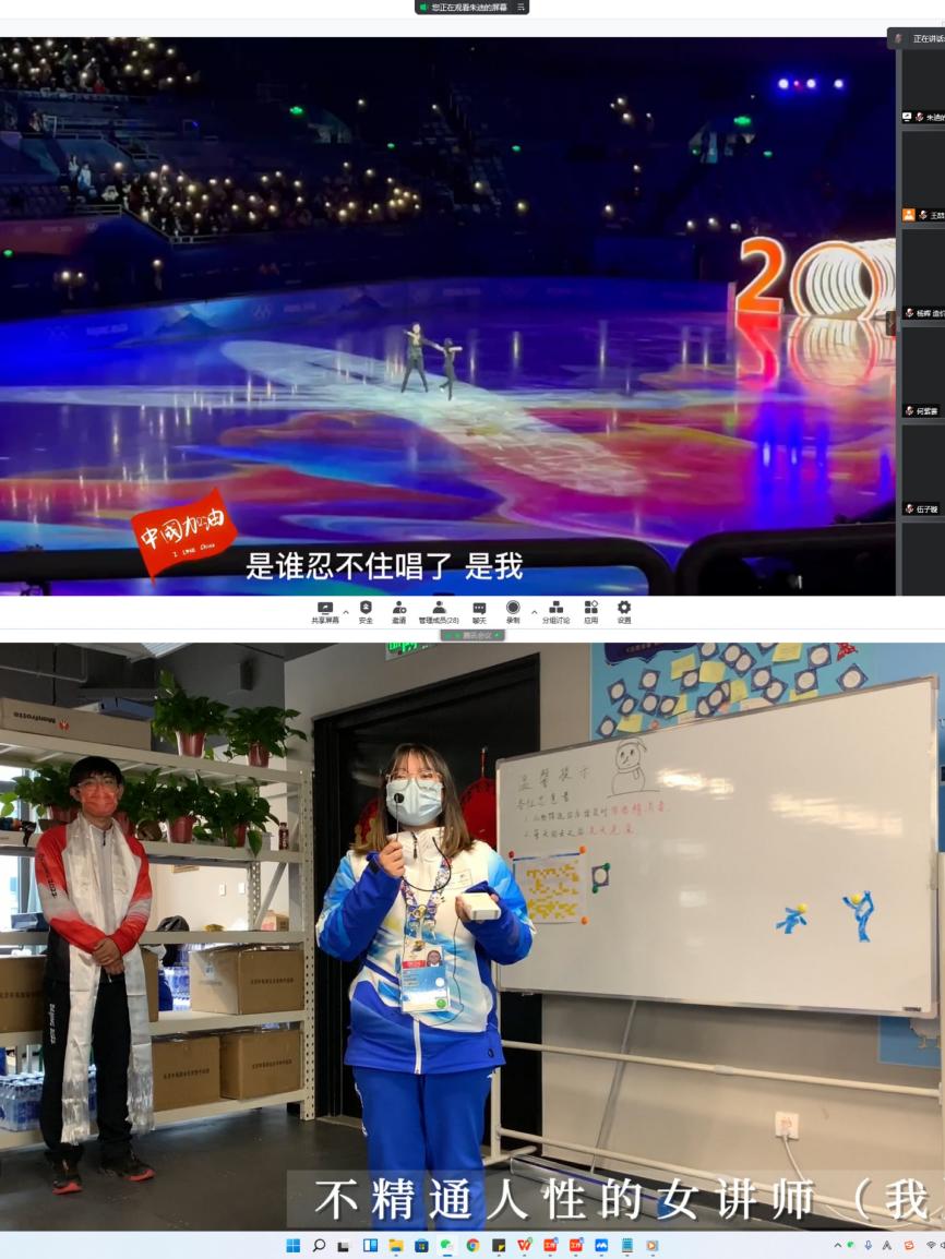 会上,交通领域志愿者伍子璇向大家展示了闭环内志愿者驻地环境,介绍了隔离安排。场馆通行控制志愿者王帅、赛事服务志愿者赵宇凡、体育通行控制(短道)志愿者杨凌萌、志愿者领域经理助理孙泓仪分别分享自己在冬奥志愿服务中的心得体会。场馆通行控制志愿者朱迪、赛事服务志愿者杨辉展示了自己制作的vlog。孙泓仪还向大家介绍了北京建筑大学志愿者冬奥会原创歌曲《微光筑梦》。