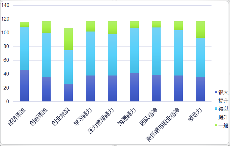 从问卷情况看,学生管理能力得到了不同程度的提升。其中“经济思维”、“创新思维”、“沟通能力”、“团队精神”、和“职业精神”得到了较大提高。