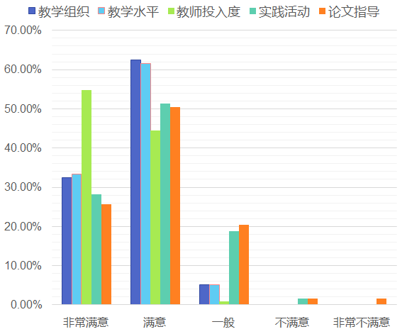 从问卷情况看,学生对扑克王 的教学活动、师德师风 是满意的。其中,“教师投入度”、“教学水平”和“课堂教学组织”达到“满意”和“非常满意”的比例在90%以上。