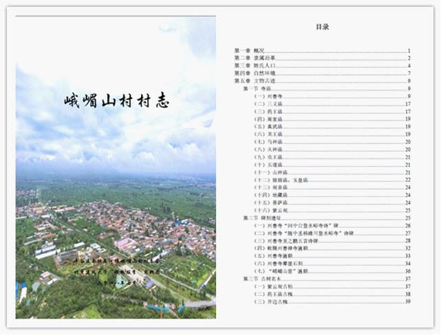 峨嵋山村村志包括概况、隶属沿革、姓氏人口、自然环境、文物古迹、发展近况共六章。其中文物古迹中包括寺庙(兴善寺、三义庙、药王庙、周家庙、真武庙、龙王庙、马神庙、火神庙、虫王庙、五道庙、山神庙、娘娘庙、玉皇庙、观音庙、地藏庙、菩萨庙、紫云观)、碑刻遗址(兴善寺“同中台登水峪寺诗”碑、兴善寺“随中丞杨睛川登水峪寺”诗碑、兴善寺吴之鹏五言诗碑、敕赐兴善禅寺匾额、兴善寺匾额、兴善寺摩崖石刻、“峨嵋山营”匾额)、古树古木(紫云观古柏、药王庙古槐、井边古槐)、古陵古墓(东沟明代墓)共四节,发展近况包括交通状况、政治经济状况、精神文明建设共三节。