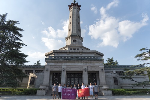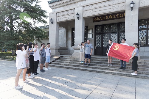 怀着庄重严肃的情绪,实践团成员寻访位于长沙市区北部的烈士公园。烈日下本科生第一党支部党员王博辉、段昭璐手托党旗带领全体实践团成员登上纪念塔基,在实践理论指导教师陈南雁老师的带领下集中宣誓,重温入党誓词。和平年代,虽不用党团青年抛头颅、洒热血,但坚定地社会主义信念始终坚守在党员师生的意识中、践行于行动中。集中宣誓仪式让全体党员同志时刻牢记以为人民服务为己任,以革命烈士的业绩为鼓舞,不忘初心、牢记使命、携手并进、砥砺前行。