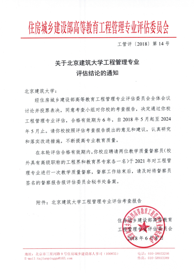 根据住房城乡建设部高等教育工程管理专业评估委员会《关于北京建筑大学工程管理专业评估结论的通知》(工管评[2018]第14号)文件,经住房城乡建设部高等教育工程管理专业评估委员会全体会议讨论并投票表决,我校工程管理专业评估获得通过,合格有效期为6年,自2018年5月起至2024年5月止。