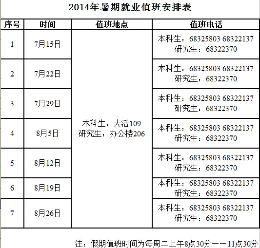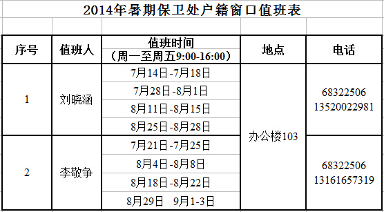 2014年暑期就业值班与保卫处户籍窗口值班通知